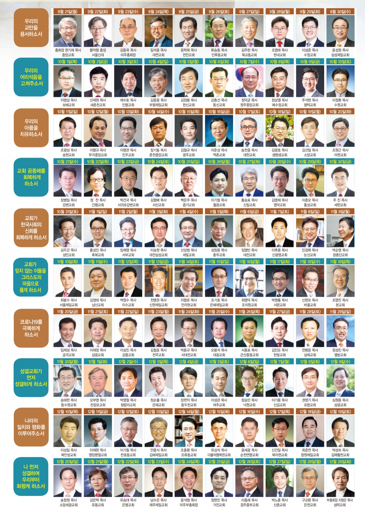 100일 정오기도회는 ‘우리의 교만을 용서하소서’(21~30일), ‘우리의 어리석음을 고쳐주소서’(10월 1~10일), ‘우리의 아픔을 치유하소서’(10월 11~20일) 등 10가지 주제로 진행될 예정이다. 강사는 한기채 총회장을 필두로 황덕형 서울신대 총장, 김동욱 미주성결교회 총회장 등 교단 소속 100명 목회자가 강사로 차례로 기도회를 인도한다.