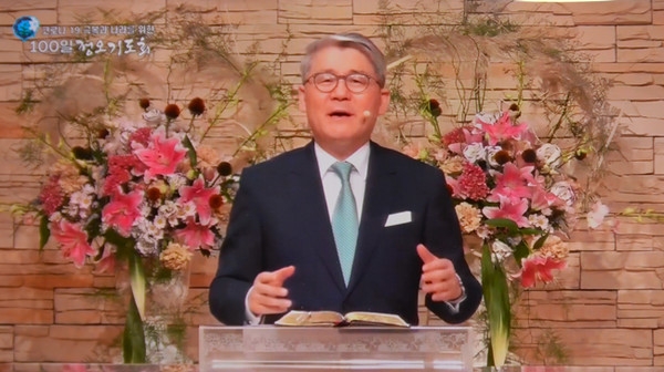 한기채 총회장이 '100일 정오기도회' 첫날 말씀을 선포하는 모습. 기도회는 유튜브를 통해 온라인으로 9월 21일 정오에 진행됐으며, 녹화 영상은 이후로도 언제 어디서나 다시 볼 수 있다.