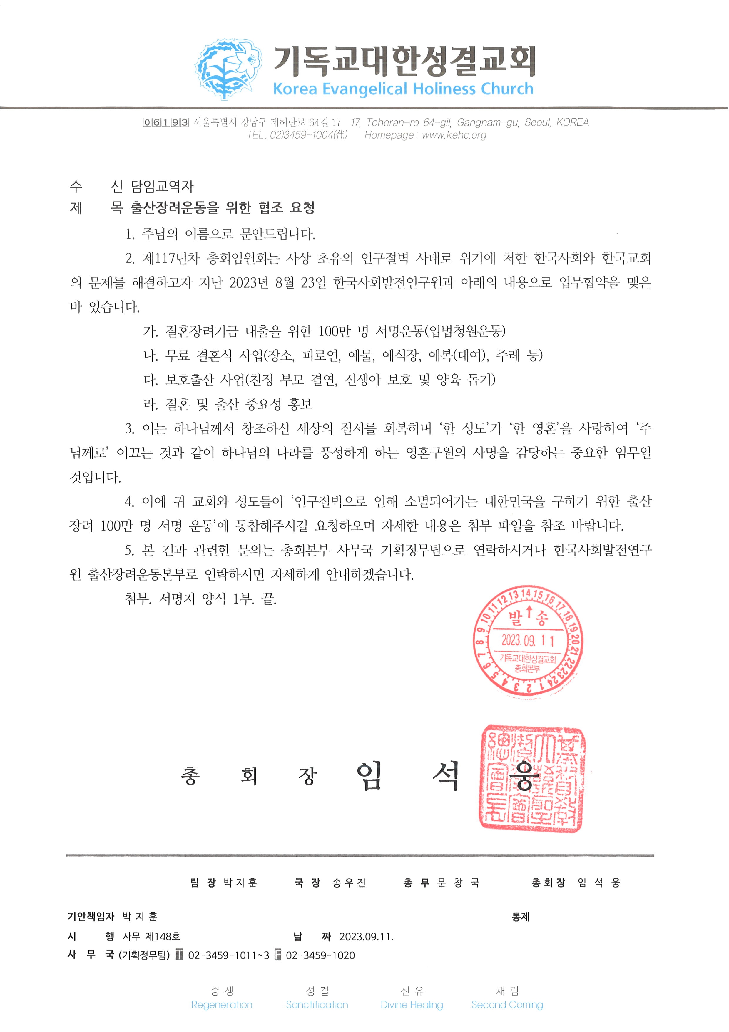 3. 이에 귀 교회와 성도들이 ‘인구절벽으로 인해 소멸되어가는 대한민국을 구하기 위한 출산 장려 100만 명 서명 운동’에 동참해주시길 요청하오며 자세한 내용은 첨부 파일을 참조 바랍니다.