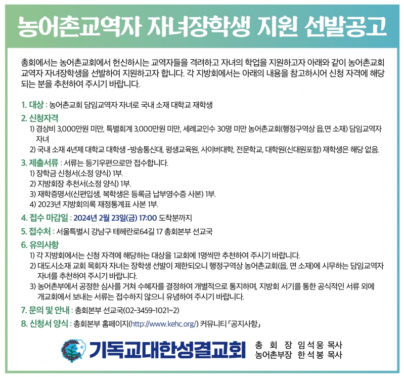 2024 봄학기 농어촌교역자 자녀장학금 지원선발공고