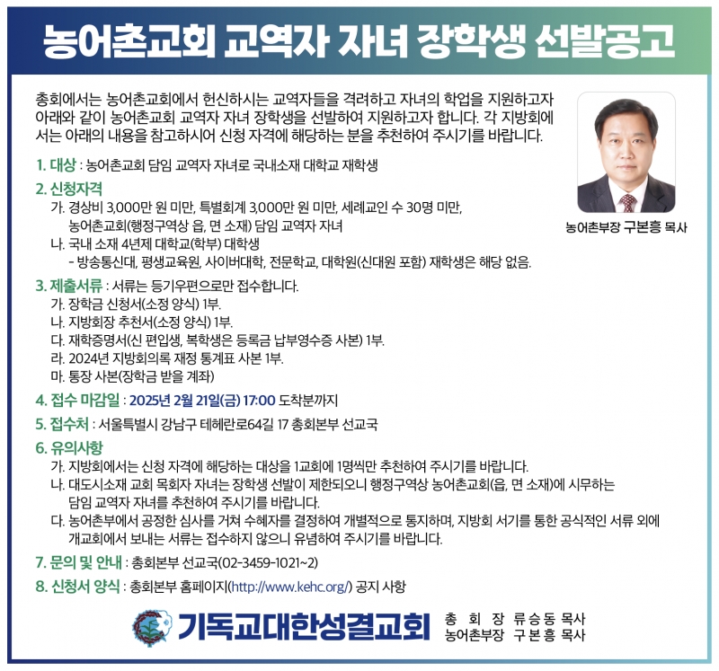 2025 봄학기 농어촌교역자 자녀장학금 지원선발공고